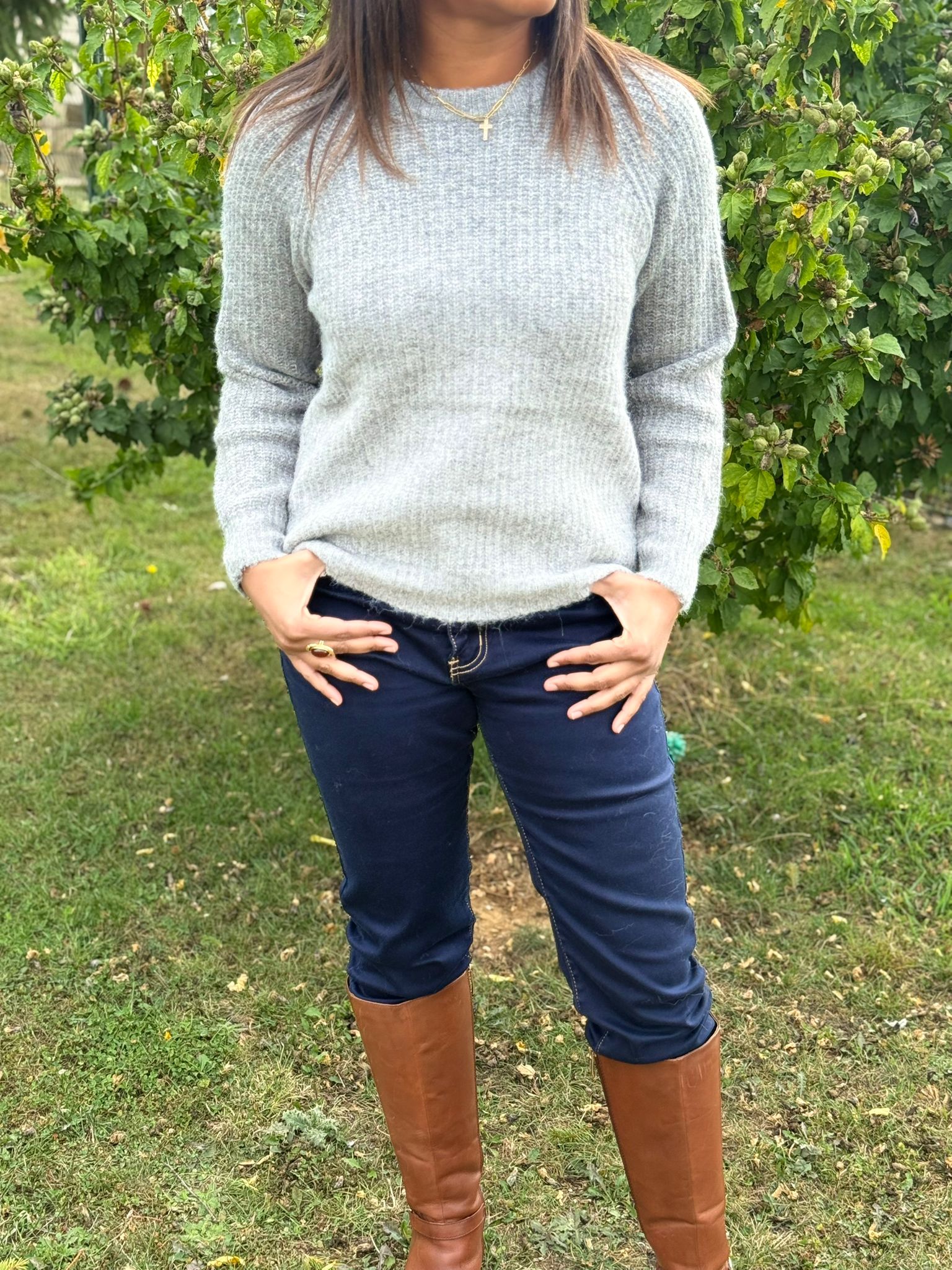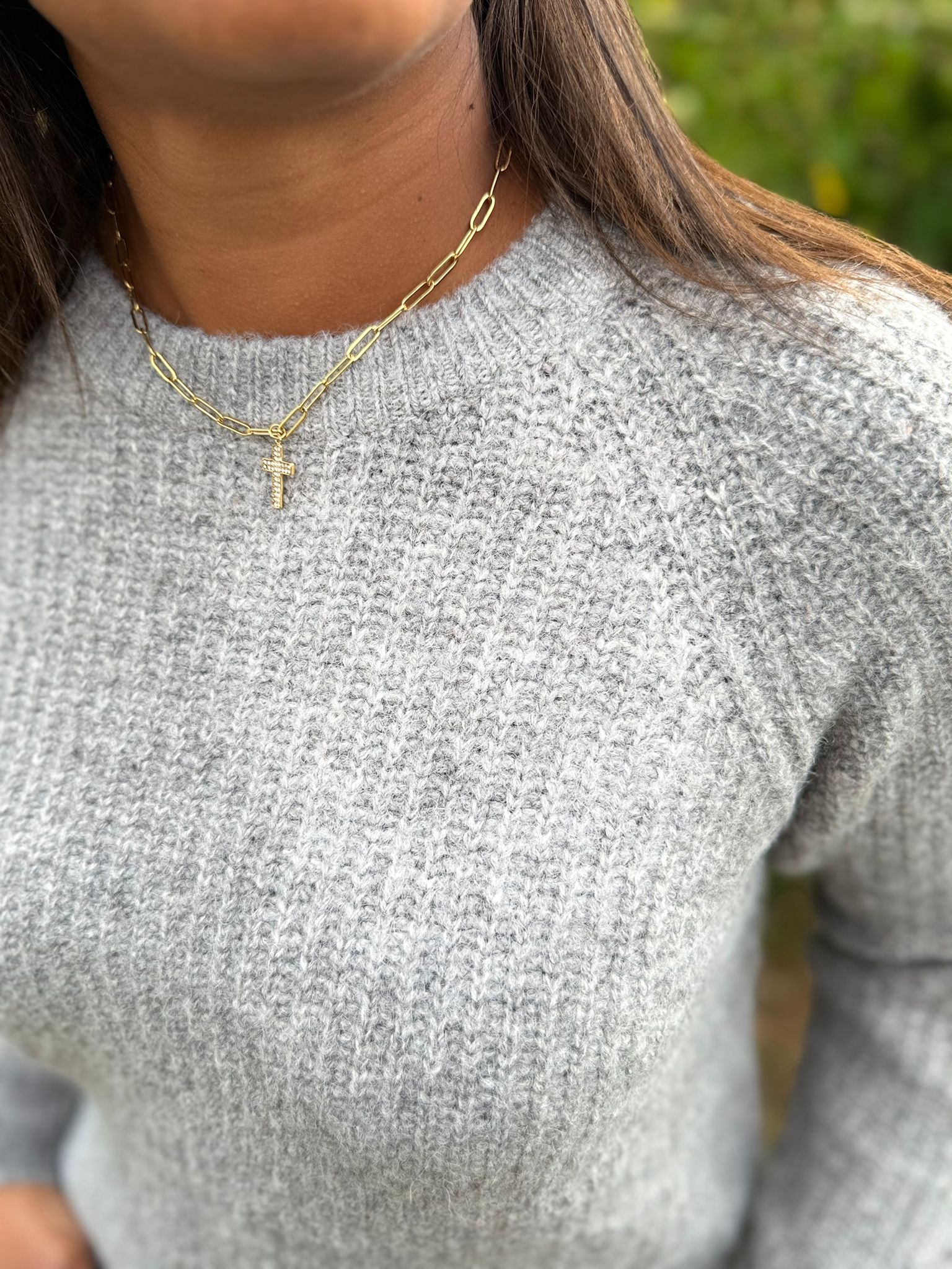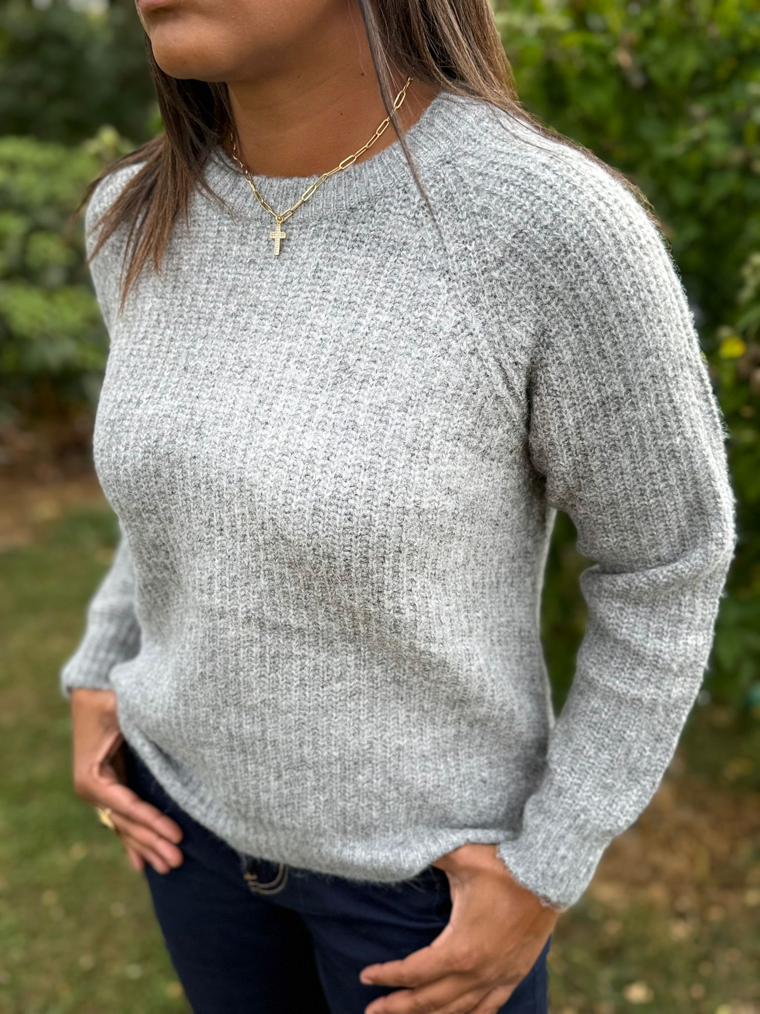 Pull épais de couleur gris. Col rond. Manches longues. Taille-Unique.